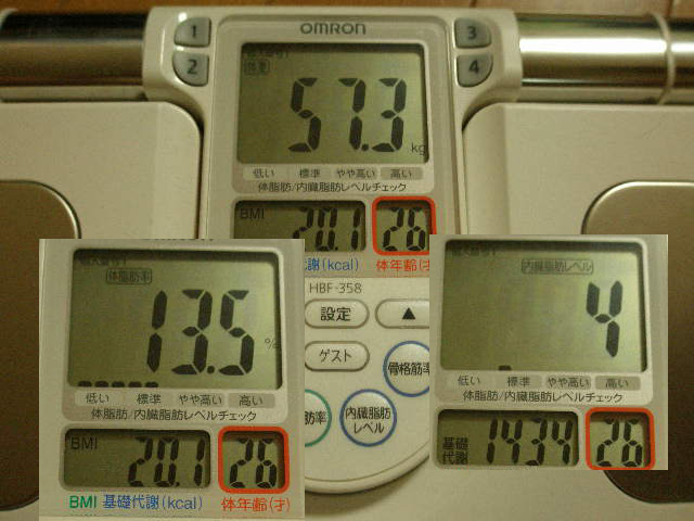 今日の測定結果ですが、体重57.3キロ、体脂肪率13.5%、