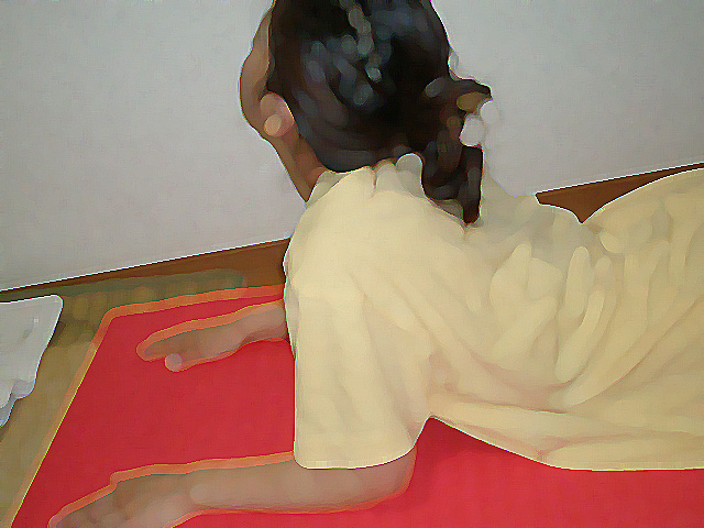 3、息を少しずつゆっくり吸いながら、ひじは床(ゆか)につけたままで