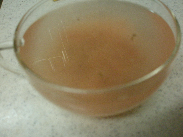 2、「1.」のコップにお湯を入れ、梅干のつぶしながら