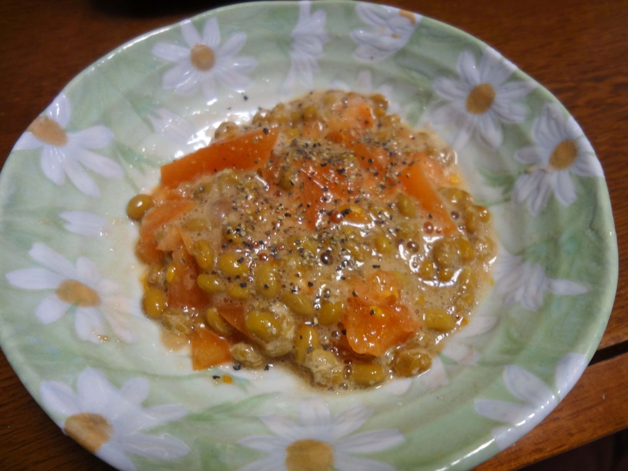3、器に「2.」のトマト、ナットウ、タレを入れて、かき混ぜ、