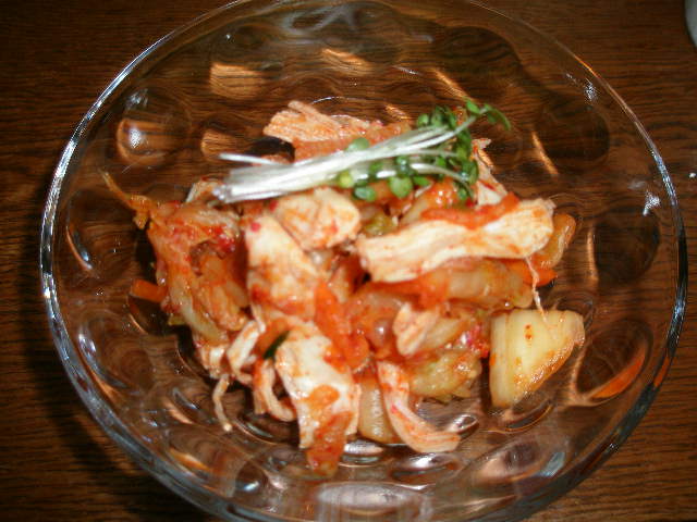 3、加熱した鶏肉を手で割いて、キムチと絡めて、