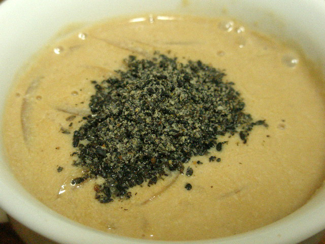 豆乳みそスープのコクのある味に黒ゴマの味があわさって、