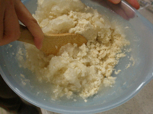 こねて、おからこんにゃくの素を作ります。