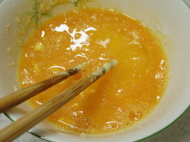 溶かした後、たまごを入れてよくかき混ぜます。