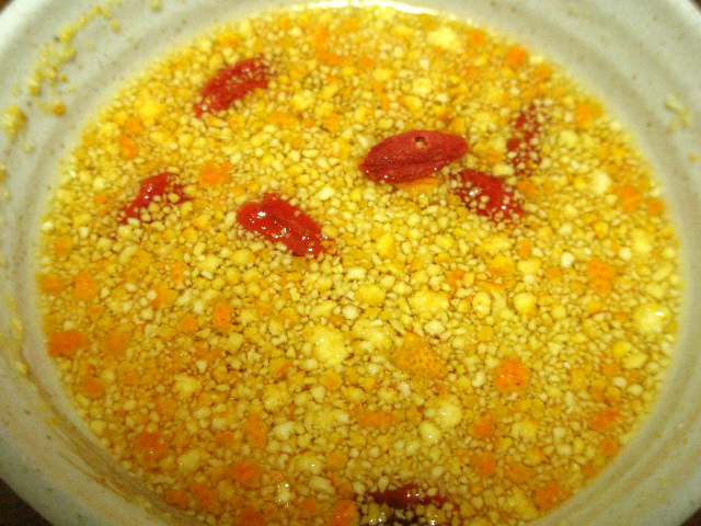 陳皮の上から、お湯を注いで、クコの実を入れて、