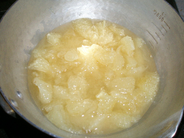 2、お鍋に「1.」のグレープフルーツの実、酢、砂糖を