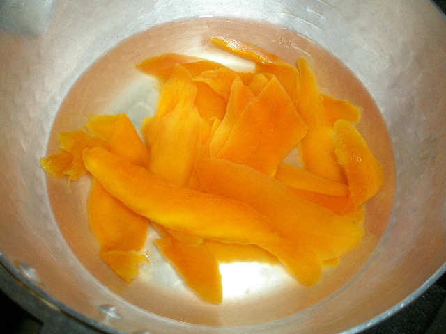 2、まずマンゴのドライフルーツをこのように熱湯の中に