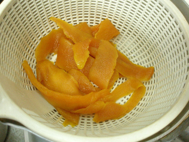 3、熱湯につけてマンゴのドライフルーツをざるなどにあけて、