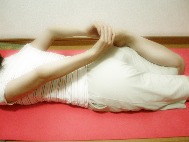 真上にあげ、息をはきながら、左足を写真のように右側に倒します。