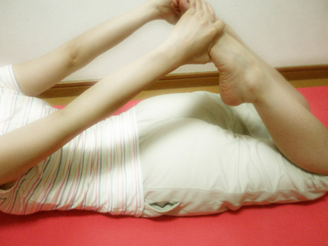 3、今度は、うつぶせのまま、右手で右足の甲を持ち、